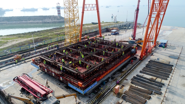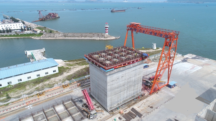 本次沉箱澆筑施工采取整體滑模工藝,澆筑過程中共采用164臺液壓千斤頂,以液壓千斤頂為提升動力部件,配合爬桿、提升架將模板整體提升,需連續(xù)滑升施工70多小時。據(jù)了解,為降低沉箱出運風(fēng)險,本次采取降低沉箱上部高度工藝進行澆筑(一次澆筑高度21.5m),在沉箱安裝后以二次現(xiàn)澆接高的施工方式達到該件沉箱設(shè)計高度25.5m,沉箱總重量達4512t。