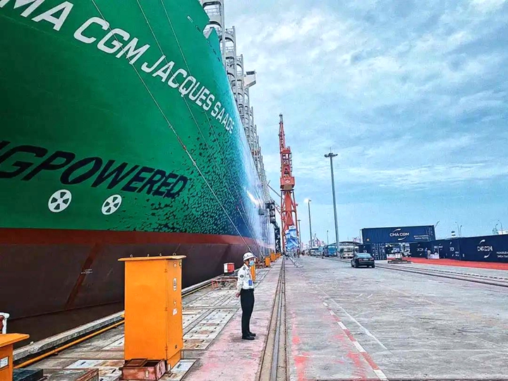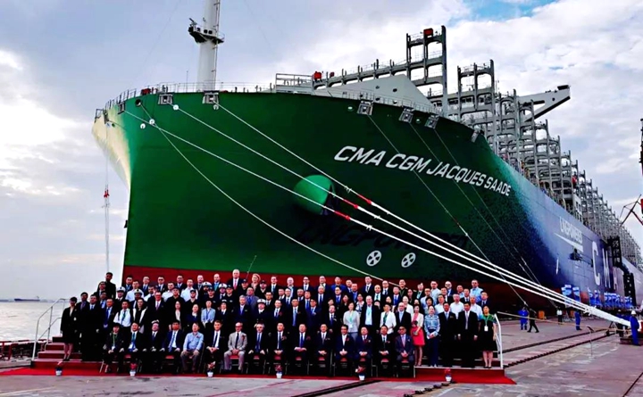 9月22日,中國船舶集團(tuán)有限公司旗下滬東中華造船(集團(tuán))有限公司和中國船舶工業(yè)貿(mào)易有限公司作為聯(lián)合賣方,為世界著名航運(yùn)公司——法國達(dá)飛集團(tuán)建造的世界首艘23000TEU雙燃料動(dòng)力集裝箱船“達(dá)飛雅克·薩德”號(hào),在上海長興島造船基地命名交付。