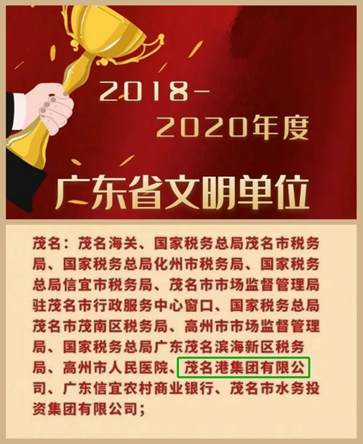 近日,廣東省精神文明建設(shè)表彰大會(huì)在廣州隆重舉行。作為成立僅八年多時(shí)間的市屬國有企業(yè),茂名港集團(tuán)榮獲廣東省2018-2020年度文明單位稱號。