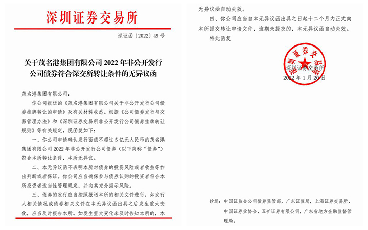 1月21日,茂名港集團(tuán)公司成功獲得深交所5億元公司債無異議函。獲得無異議函之后,標(biāo)志著我司已具備發(fā)行公司債的所有硬性條件。