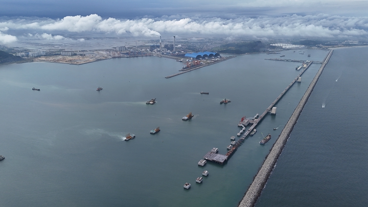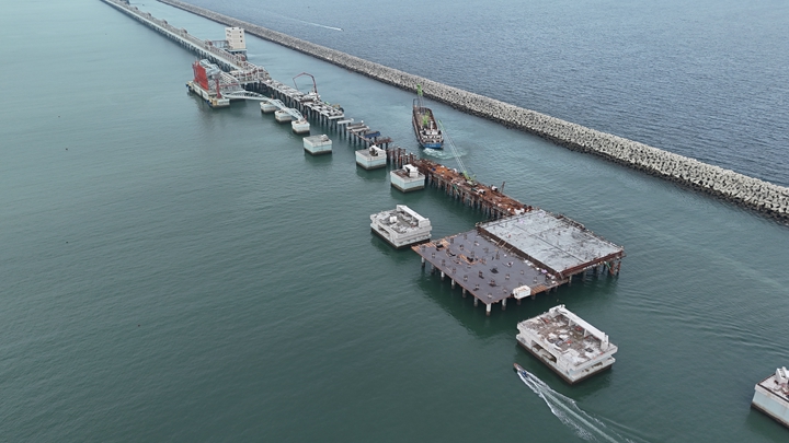 據(jù)悉,30萬噸級原油碼頭設(shè)計年吞吐量達1600萬噸,泊位長度達404米,碼頭共設(shè)計有145根樁基,由工作平臺及工作樓平臺的70根樁基和附屬管廊橋工程的75根樁基組成,其中工作平臺及工作樓平臺的70根樁基已于2023年底全部完工。