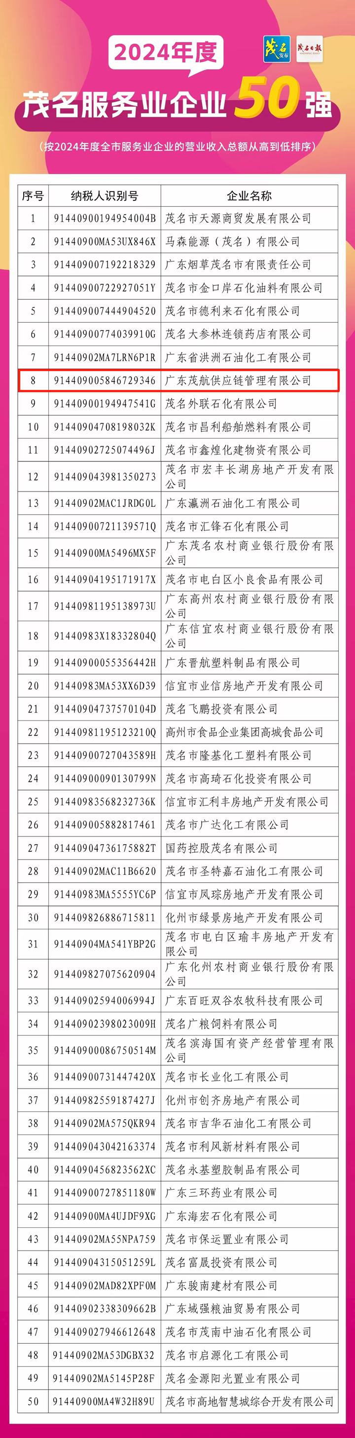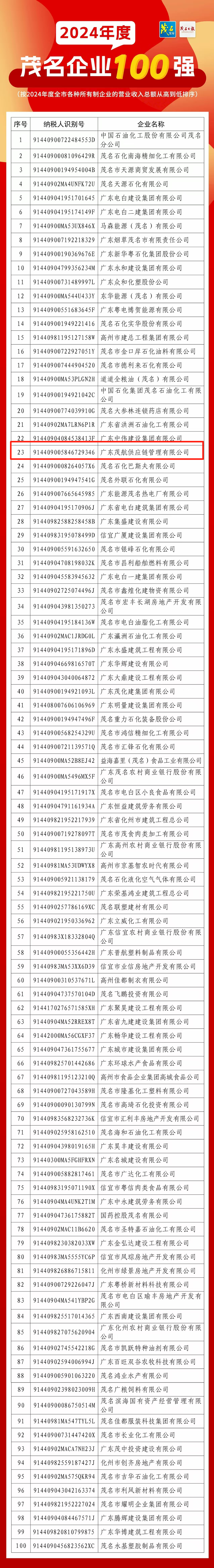 根據(jù)茂名市企業(yè)聯(lián)合會(huì)于2025年7月15日發(fā)布的通報(bào),集團(tuán)下屬茂航供應(yīng)鏈公司以優(yōu)異的業(yè)績(jī)表現(xiàn)位列茂名企業(yè)100強(qiáng)第23位,較2023年第37位躍升14名,并首次躋身茂名服務(wù)業(yè)企業(yè)50強(qiáng)第8位。此次雙榜單的歷史性突破,標(biāo)志著茂航供應(yīng)鏈公司從傳統(tǒng)供應(yīng)鏈貿(mào)易商向供應(yīng)鏈科技企業(yè)的轉(zhuǎn)型取得實(shí)質(zhì)性成果。